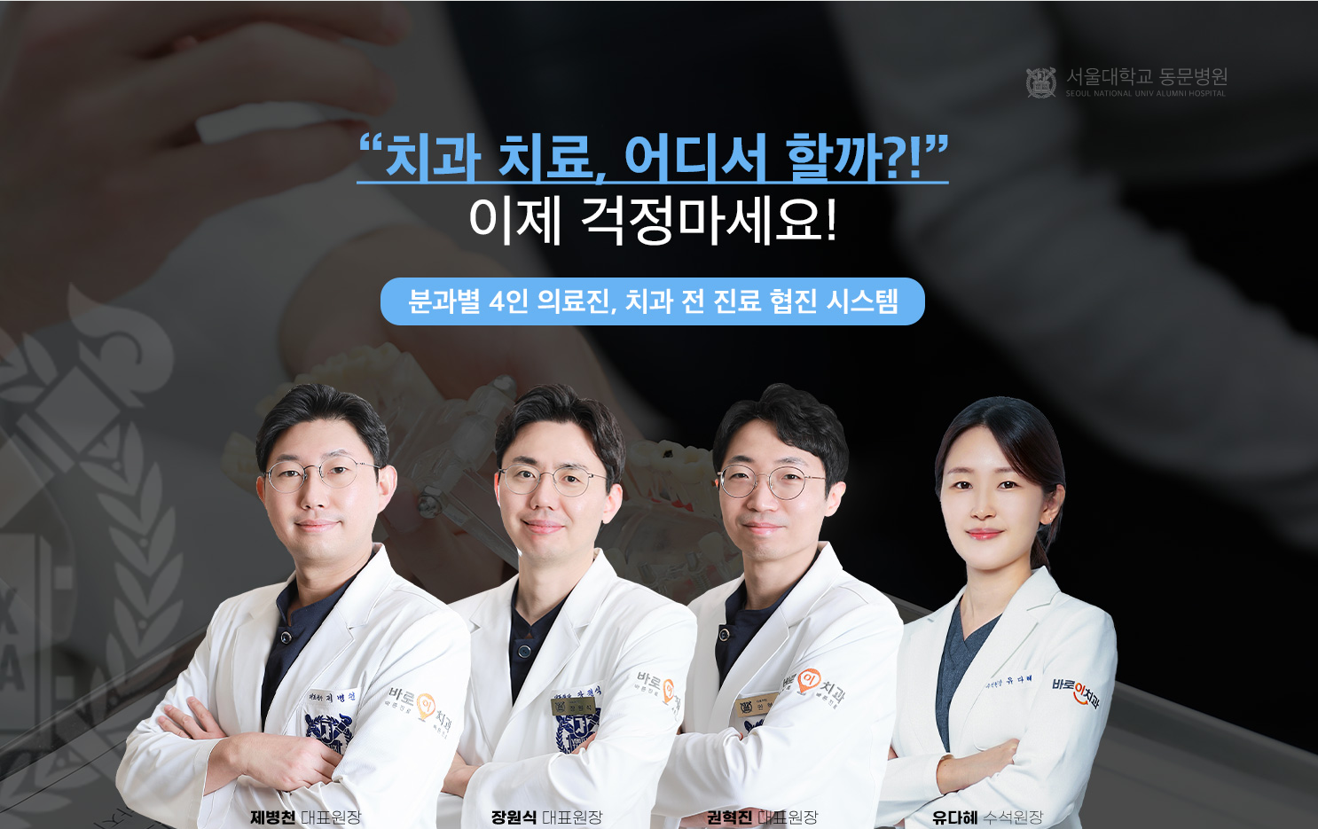수 많은 노하우와 실력을 겸비한 의료진으로 이루어져 있습니다. 다양한 임상경험으로 인해 치료 중 어떠한 상황이 벌어져도 신속하게 대처하고 치료할 수 있습니다. 믿을 수 있는 바로이치과 의료진을 만나보세요.